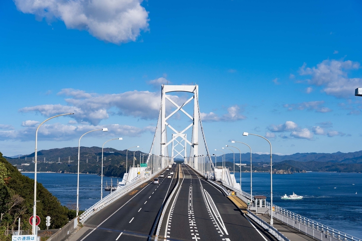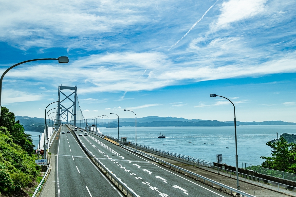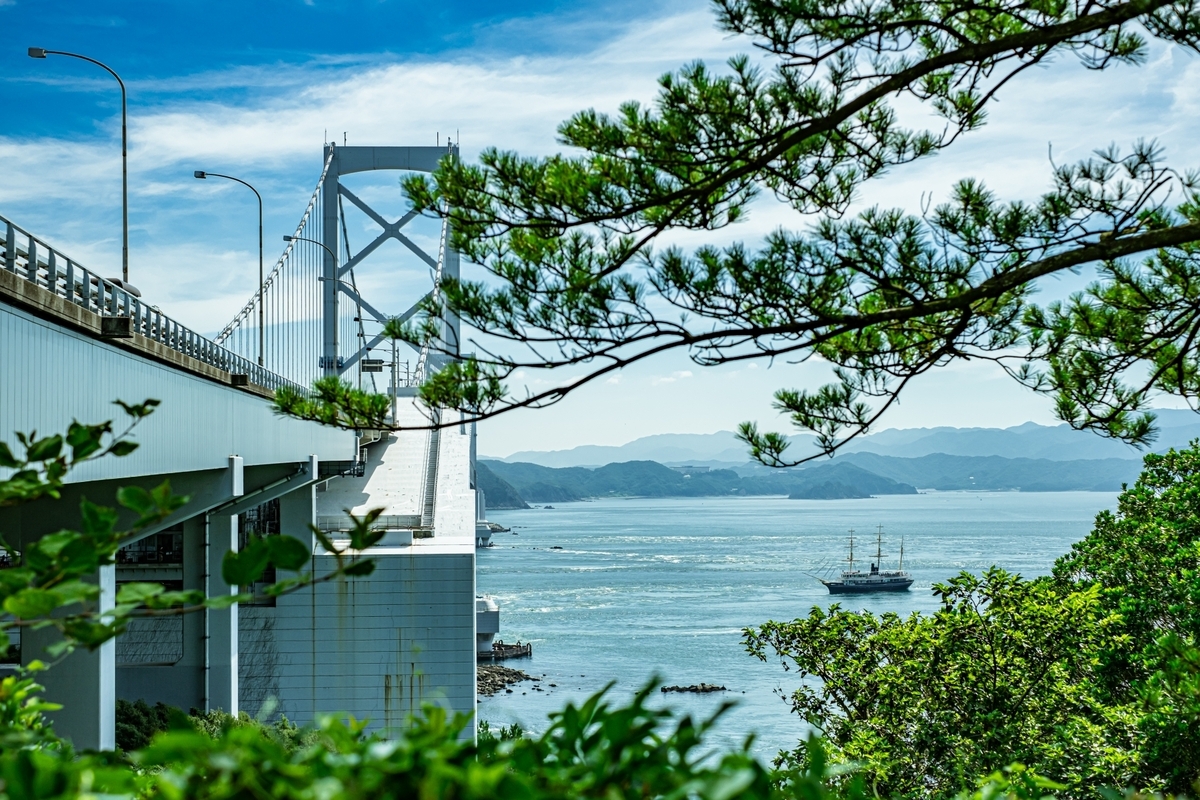 大鳴門橋沿いに鳴門海峡を臨めるこのアングルは珍しいです。ここの道は周囲が緑に囲まれていて海があまり見えないのですが、ここだけふっと景色が海に抜けるのでオススメのフォトスポットです。