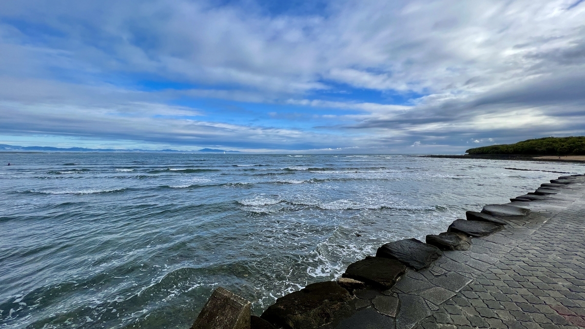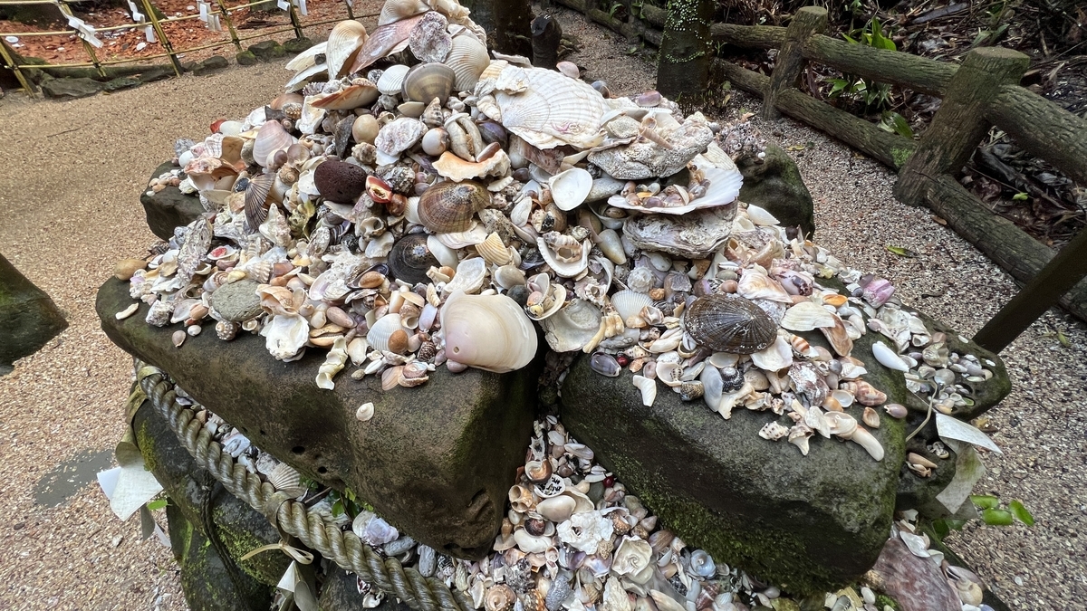 神社前の浜辺にて真砂を探し、自分の想いと願いを込めてこの波状岩にお供え下さい。