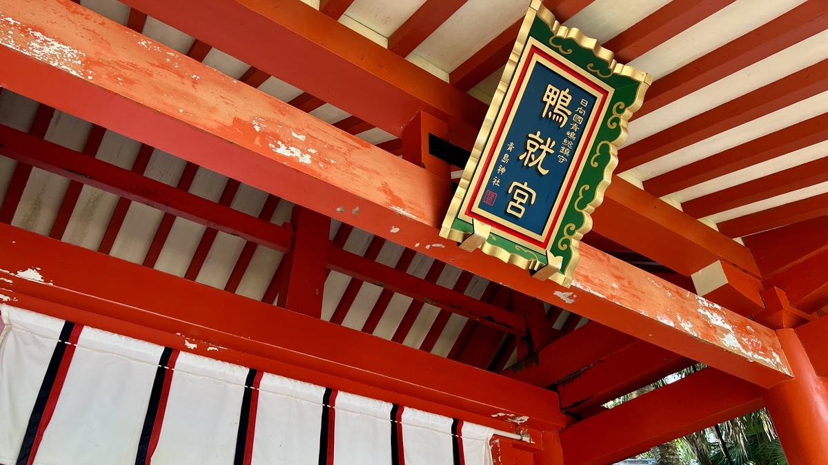 青島神社は、海岸から境内に入り、亜熱帯植物に囲まれ、そこに朱色が映える。というとても不思議な世界観を持つ神社です。