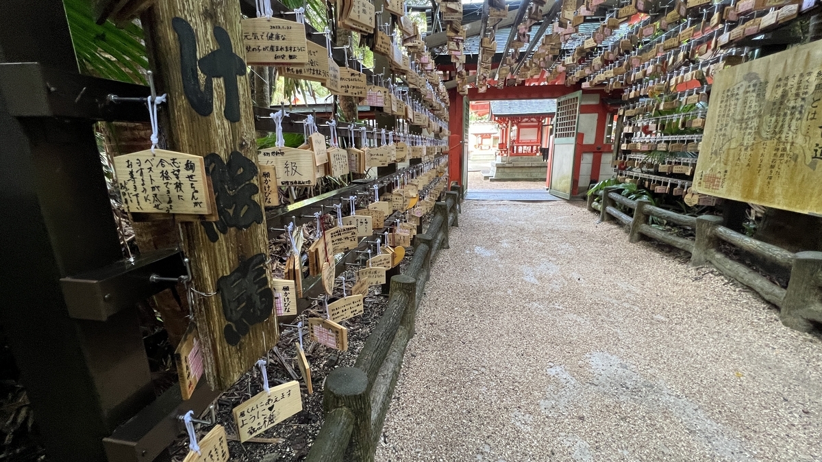 青島神社では元宮への参道に絵馬掛けを設け御参拝者の想いや願い、また御礼の言葉を伝えております。